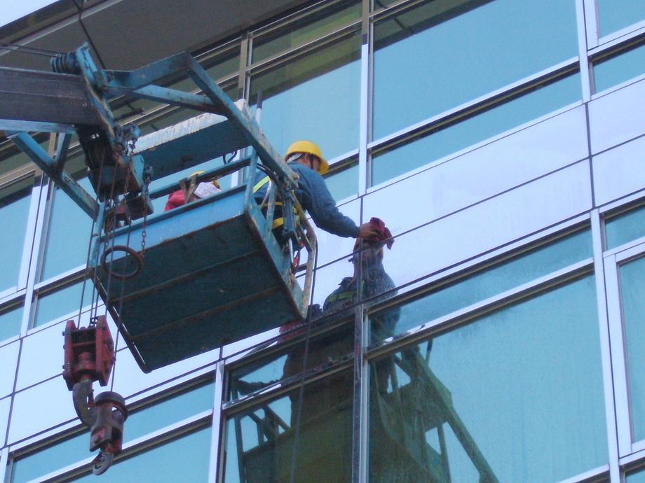外墙清洗分为吊板方式和擦窗方式。吊板方式是用吊绳、吊板将人吊到工作位置进行清洗。这种型式比较简单,成本也低,只要工人身体素质好、绳子连接牢固就可以进行。