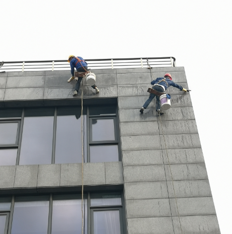 外墙清洗操作方式  1、高处吊板(绳方式):工人运用吊板(绳)下滑到指定位置进行施工操作。此施工方式具有方便、灵活,安全系数较高等特点。同时,占用资源较小,能在最大限度内减少对业主日常工作、生活影响。