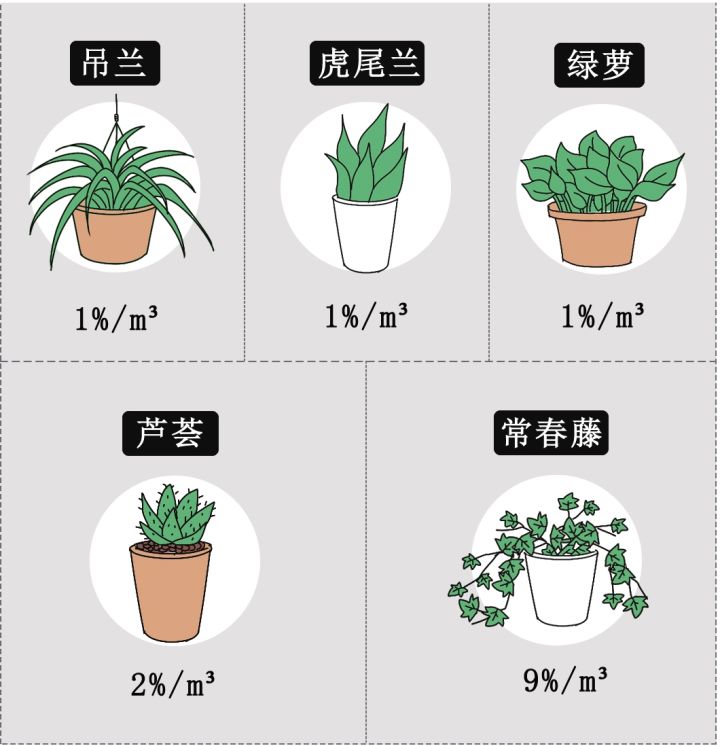 然后我给一个来自于网上的数据结论给大家:植物有一点的吸附甲醛的能力,专家给出的甲醛净化率通常为:常青藤>芦荟>绿萝≈吊兰≈虎尾兰。