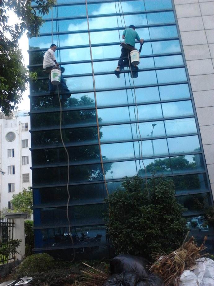 外墙清洗分为吊板方式和擦窗方式。吊板方式是用吊绳、吊板将人吊到工作位置进行清洗。这种型式比较简单,成本也低,只要工人身体素质好、绳子连接牢固就可以进行。