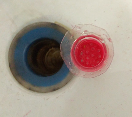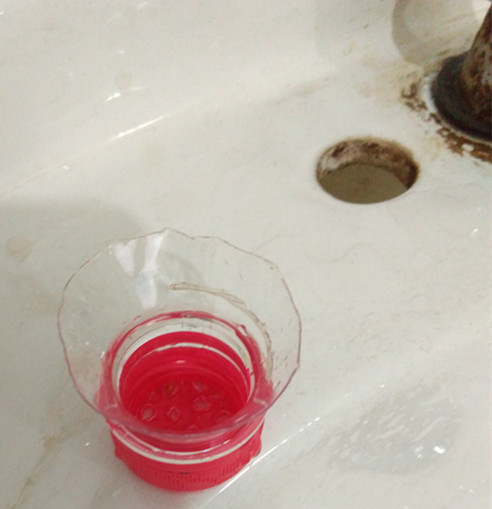 接着将瓶盖盖在瓶颈上,倒着放入面盆下水口。这样就ok了!很简单吧!如图