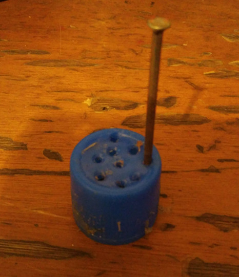首先,取下瓶盖,用大钉子在瓶盖上戳几个洞,尽量大一点,便于水能快速流走。如图